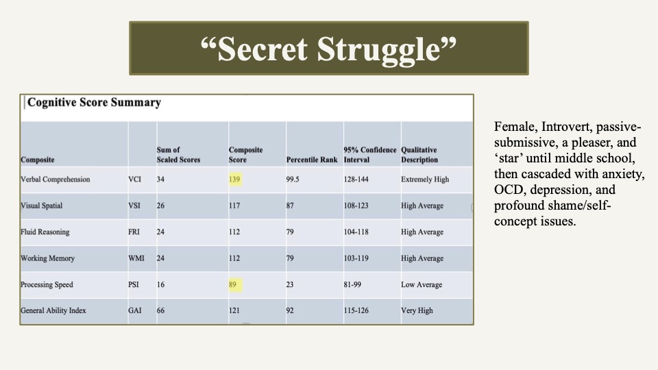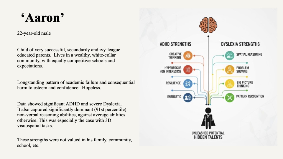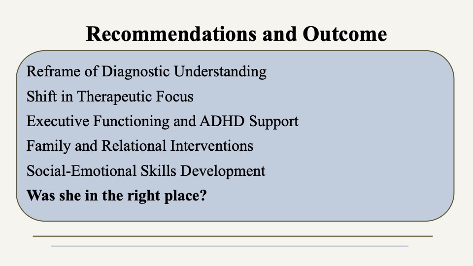 Through this targeted approach, Emma began to see improvements in her relationships as she gained tools to better navigate her cognitive splits: social world, recognizing and compensating for her non-verbal communication gaps. With continued support, Emma also started to improve her academic trajectory and cultivated a healthier sense of self-worth.
