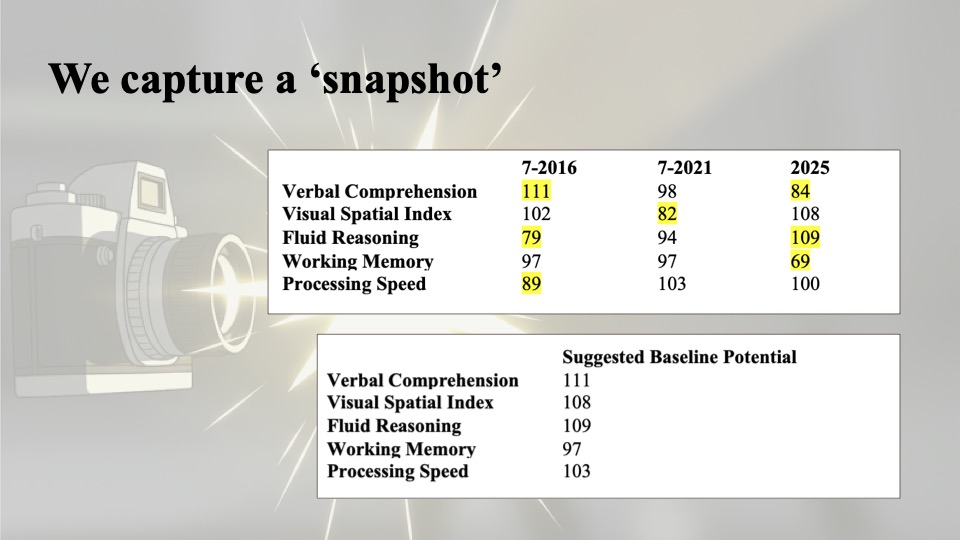 Cognitive splits refer to significant discrepancies within an individual’s intellectual profile, as assessed by four key domains: Verbal Intelligence, Non-verbal/Spatial Intelligence, Working Memory, and Processing Speed. Such imbalances can range from a pronounced divide between verbal and non-verbal intelligence to distinct contrasts like slower processing speed or sluggish working memory compared to other cognitive abilities.