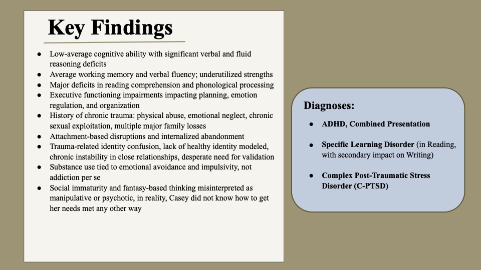 This narrative style of reporting weaves together a comprehensive life story, including developmental milestones, academic history, family dynamics, personal achievements, and traumatic experiences, offering a fuller understanding of the individual. This approach acknowledges the client as a whole person, not just a case with a diagnosis.