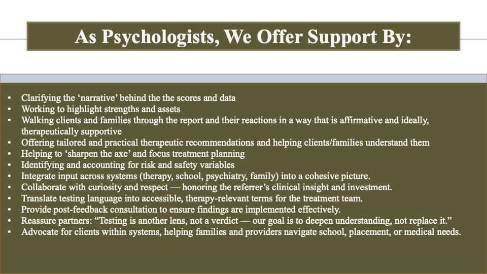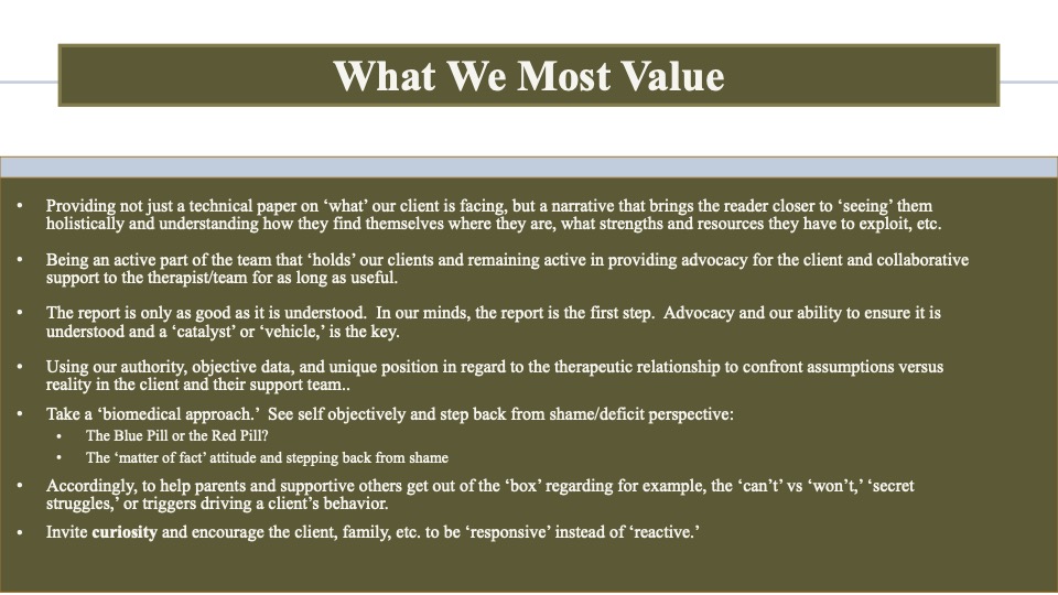 Finally, a critical aspect and one that has a substantial impact on the quality of our work is our ability to build and maintain rapport with our clients. Often our clients are anxious about being tested and need time to be comforted, reassured, and to feel they can trust us. In-person interactions allow the opportunity to develop this key foundation with our clients. Remote interaction inevitably creates a degree of distance that may leave clients feeling less comfortable, trusting, open, or able to communicate as effectively as they would otherwise.